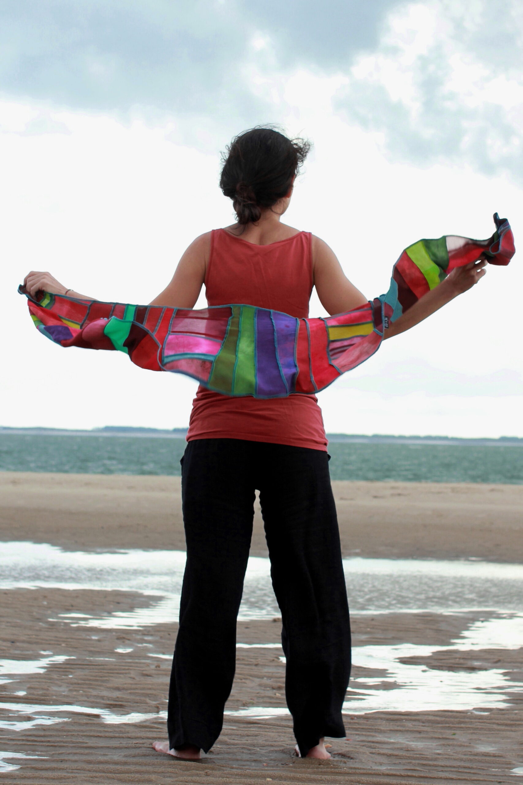 Viscose sjaal gemaakt van restanten stof die altijd overblijven als ik bloezen geknipt heb. Deze sjaal heeft nóg kleinere stukjes.