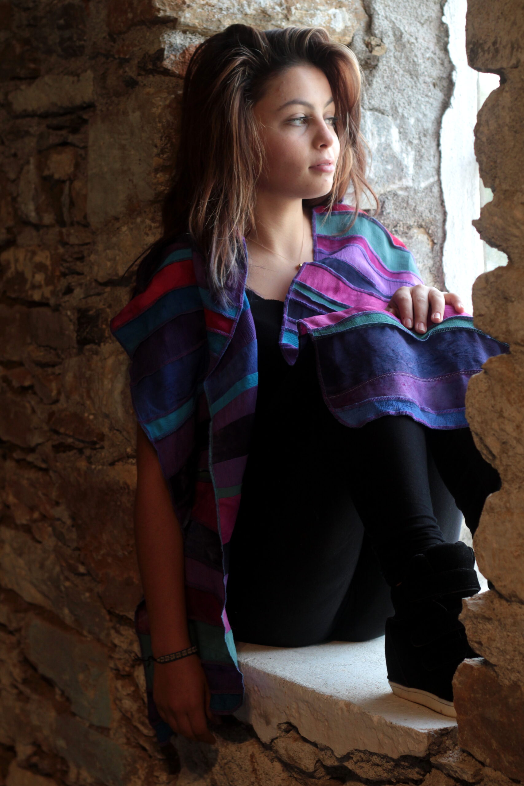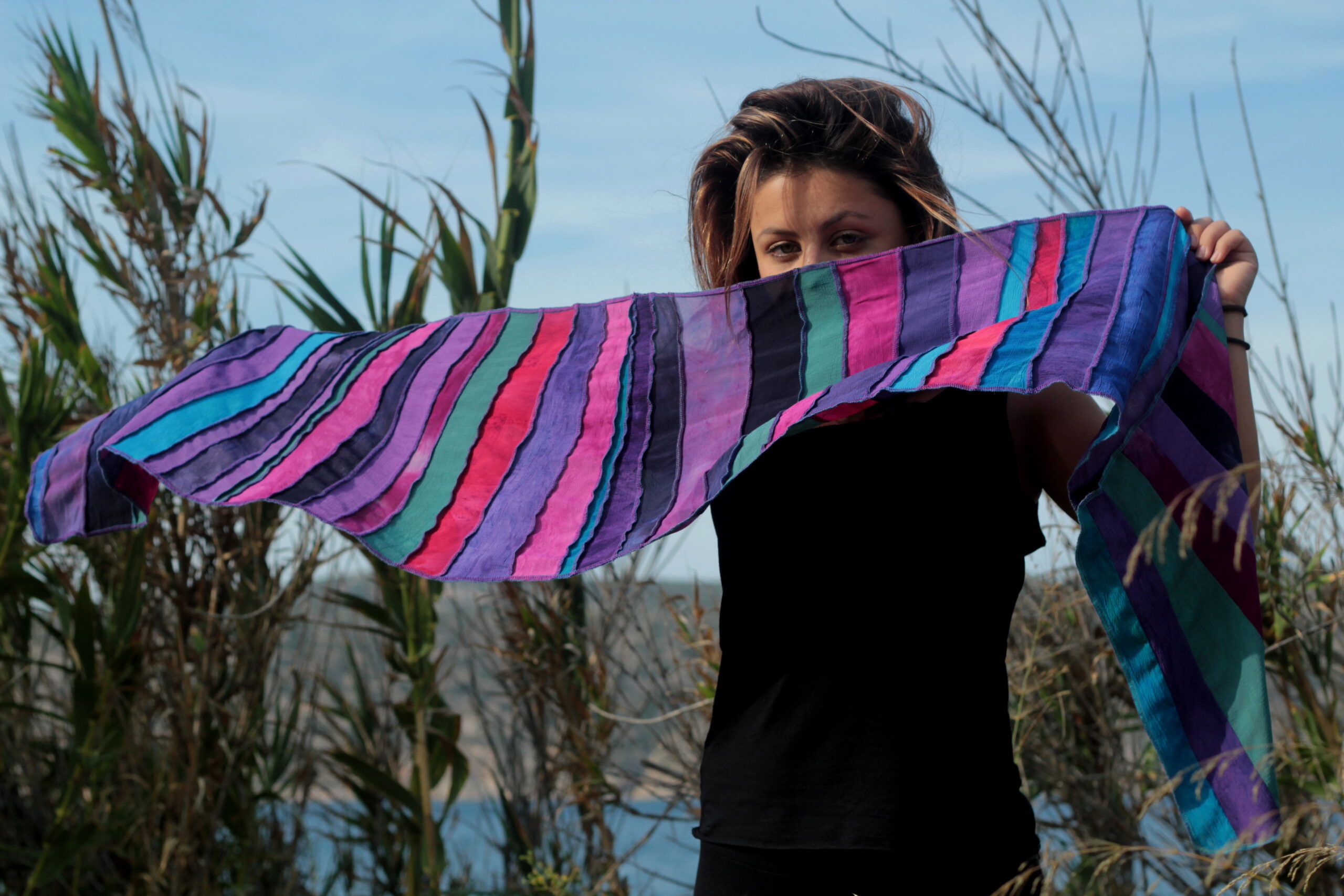 Deze viscose sjaal is gemaakt van restanten stof die altijd overblijven als ik bloezen geknipt heb. Ik ben blij dat er zo minder stof weggegooid wordt en tegelijkertijd maak ik VROLIJKE SJAALS! Verschillende soorten viscose zijn verwerkt in deze sjaal: glad, ietsjes gekreukt, doorzichtig, dunner en dikker, glanzend en mat.